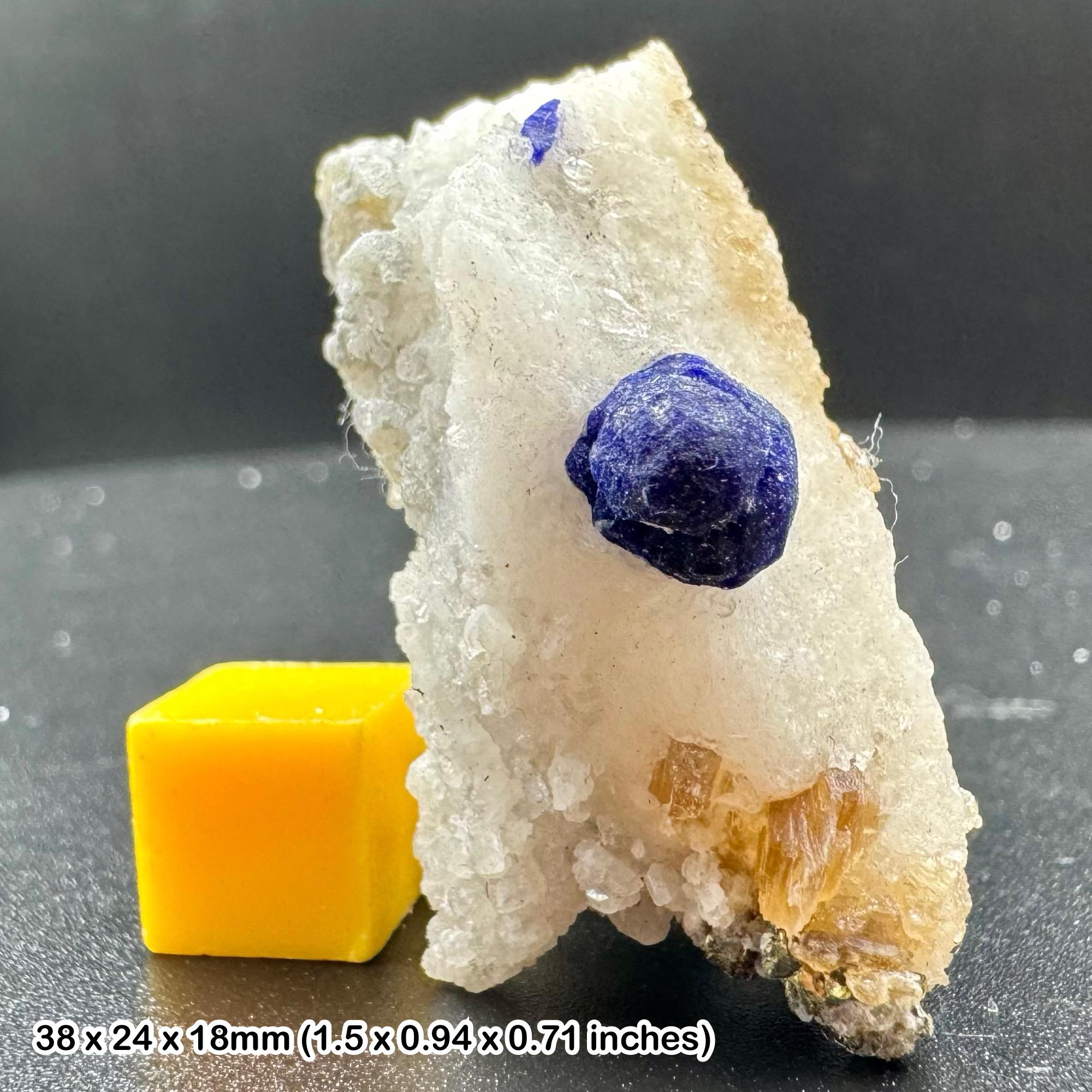 Presenting a stunning Grade A Lazurite on Calcite with Pyrite crystal specimen, mined from the famous Sar-e Sang Mine in Badakhshan, Afghanistan. Known for producing some of the world’s finest Lazurite, this piece showcases the deep, rich blue of Lazurite contrasting beautifully with white Calcite and flecks of sparkling Pyrite, making it a visually captivating and rare addition to any mineral collection.