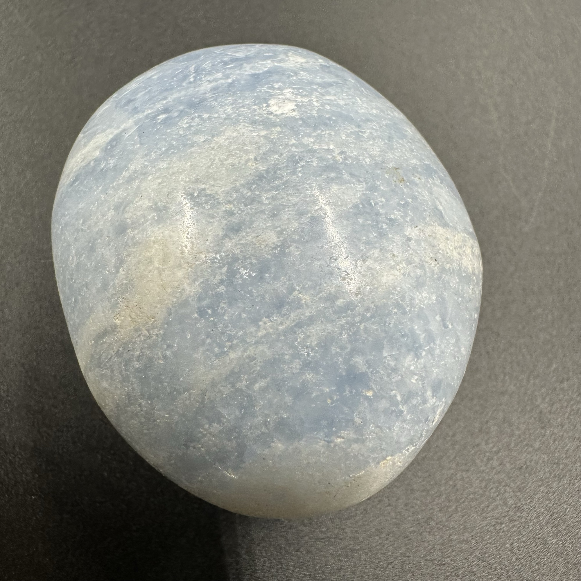Calcite belongs to the trigonal crystal system and is one of the most chemically and structurally diverse minerals on Earth. Although Blue Calcite often occurs in massive rather than distinct crystal form, microscopic rhombohedral cleavage planes and internal lattice structures give each pebble its characteristic texture and soft internal glow.