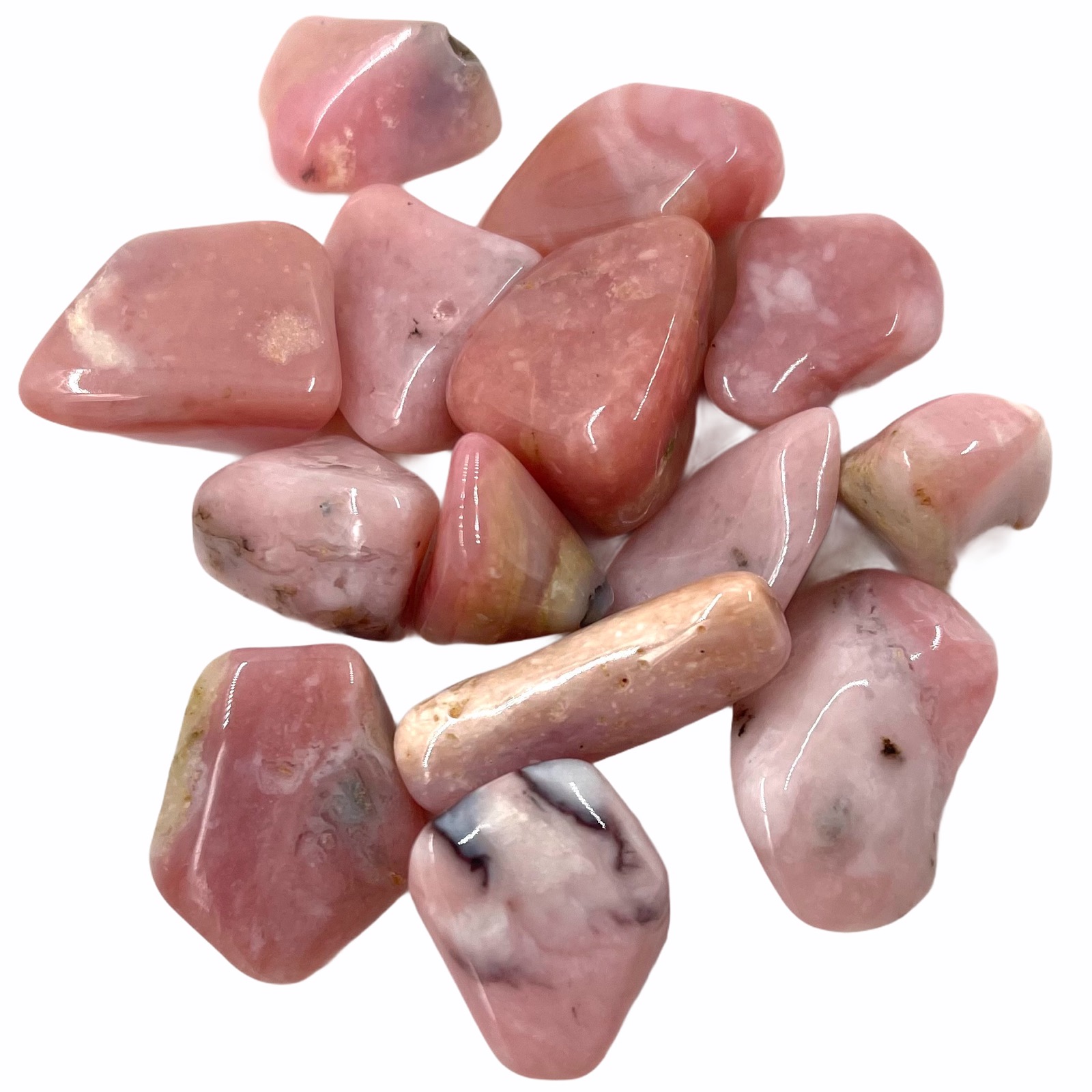 Tumblestones or “tumbled stones” as they are also referred to are made by “tumbling” rough crystals, minerals or rocks in grit for a number of days in a tumbler machine. Different grades of grit are used in the process until the rough edges are smoothed, then polish is added to bring a soft shiny surface to the specimen. Because of this process each stone will be unique in shape and colour.
