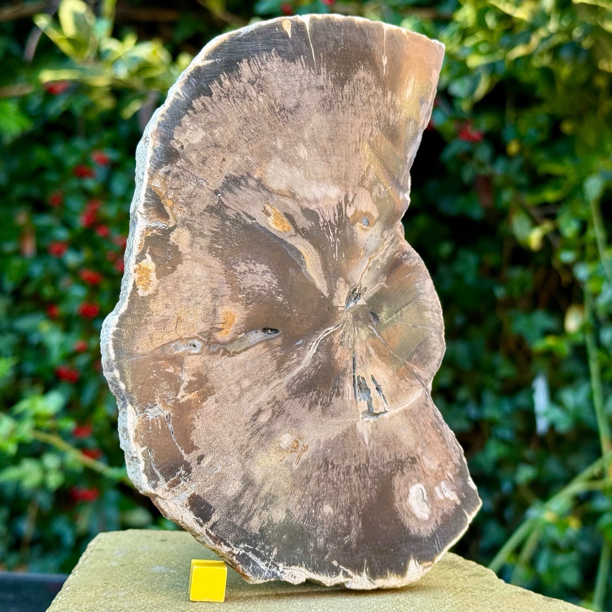- Condition: Polished fossil slice, displaying natural patterns and textures from the original wood.