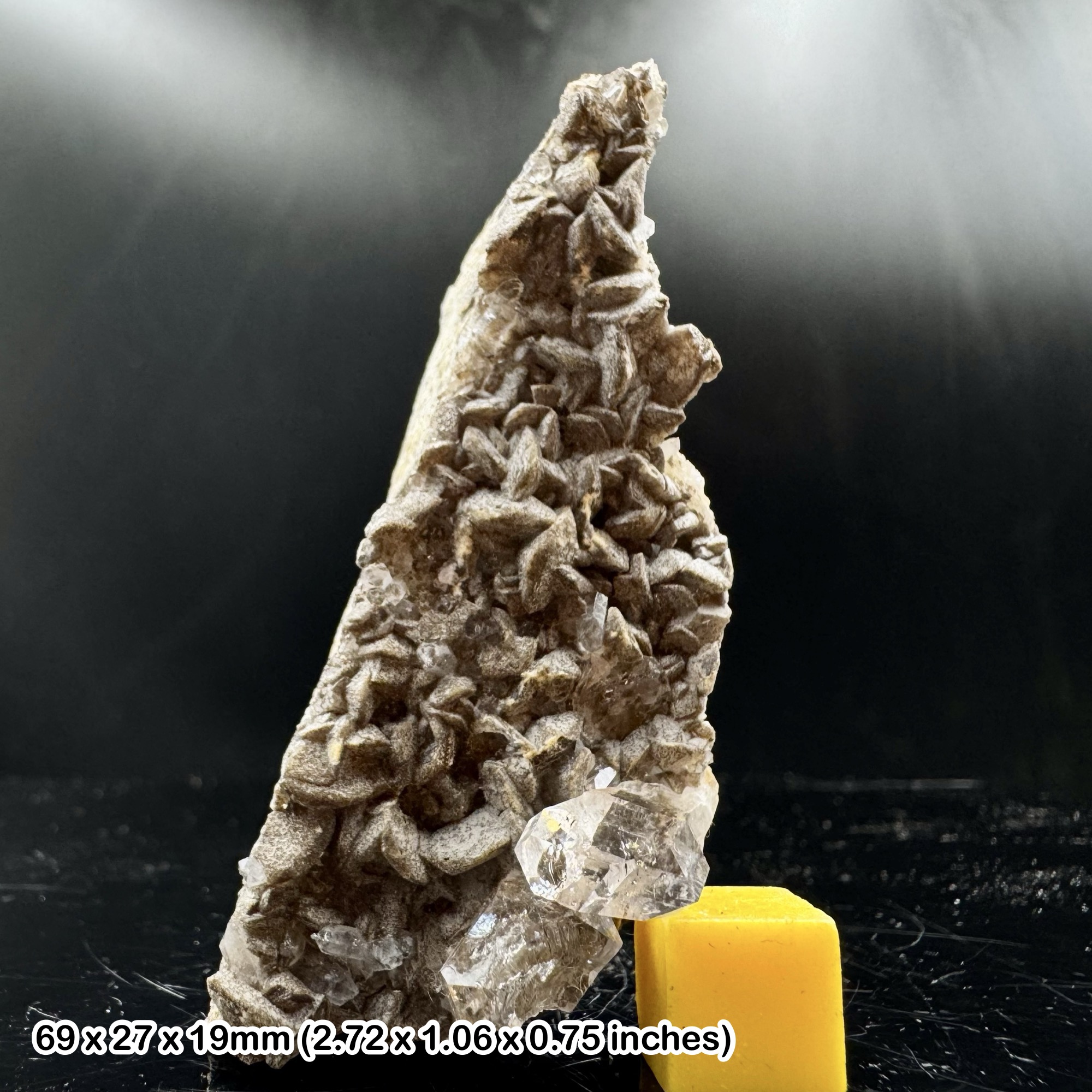 Herkimer Diamonds are a unique variety of double-terminated Quartz (SiO₂). While most quartz crystals grow attached to a matrix with only one natural termination, Herkimer Diamonds form free-floating within cavities of sedimentary rocks, giving them their distinctive dual terminations. In Balochistan, these crystals develop within dolomitic limestone and other host rocks under low-grade metamorphic conditions. Over millions of years, silica-rich hydrothermal fluids filled small pockets in the rock, precipitating quartz in perfect, isolated forms.