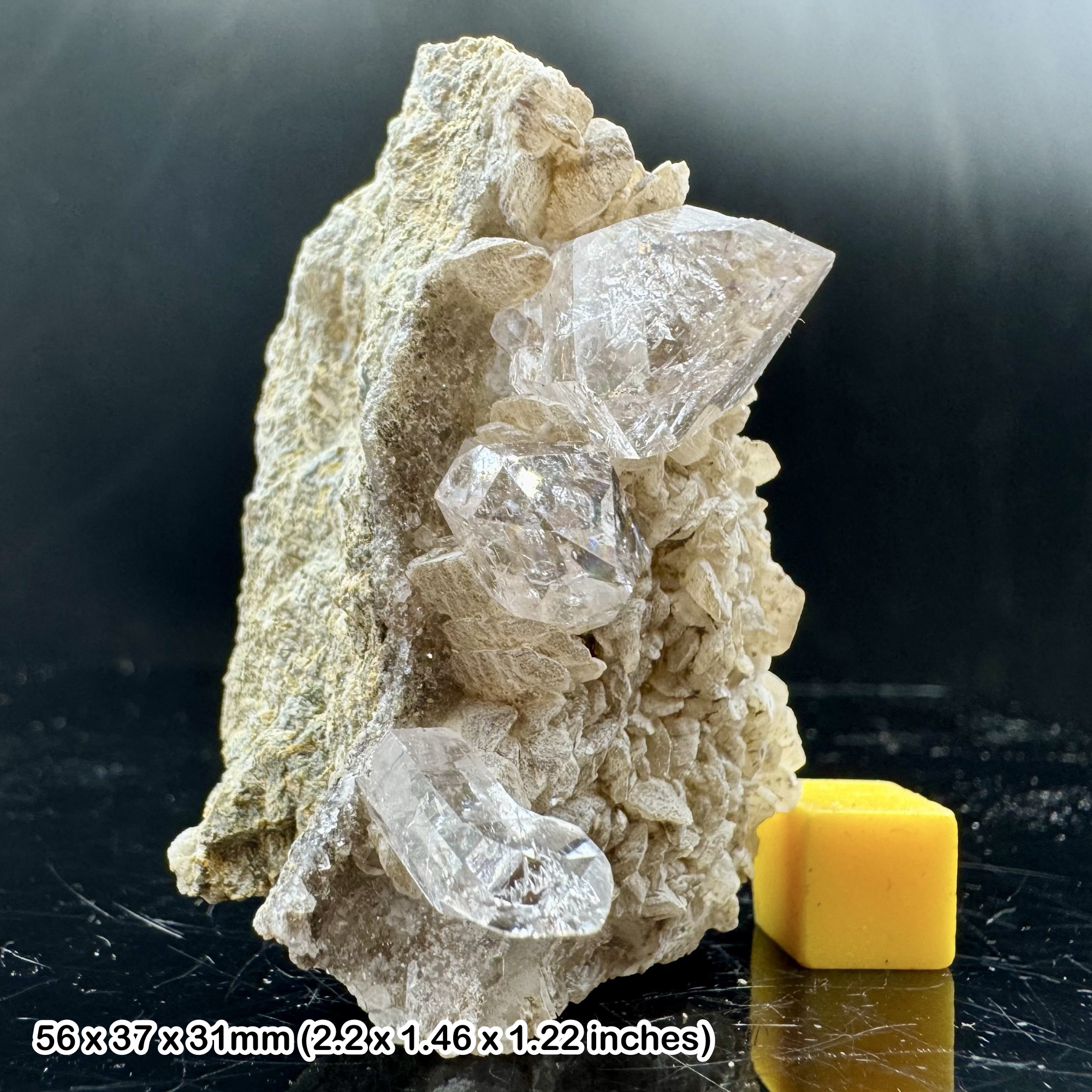 Herkimer Diamonds are a unique variety of double-terminated Quartz (SiO₂). While most quartz crystals grow attached to a matrix with only one natural termination, Herkimer Diamonds form free-floating within cavities of sedimentary rocks, giving them their distinctive dual terminations. In Balochistan, these crystals develop within dolomitic limestone and other host rocks under low-grade metamorphic conditions. Over millions of years, silica-rich hydrothermal fluids filled small pockets in the rock, precipitating quartz in perfect, isolated forms.