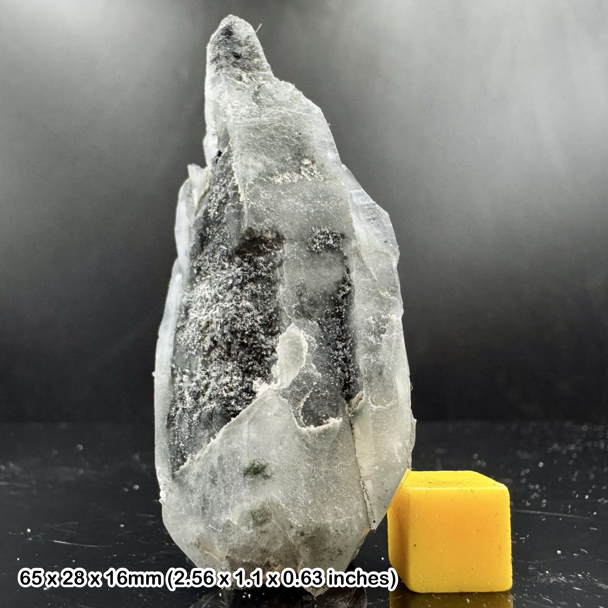 This is a rare Laser Quartz crystal containing black Tourmaline inclusions, sourced from the world-famous Skardu region of Pakistan. Laser Quartz is prized for its elongated prismatic form and clarity, while Tourmaline inclusions add striking contrast, making each specimen completely unique. The synergy of these two minerals creates a specimen of both aesthetic beauty and geological importance. The exact specimen photographed, displayed with a 1cm scale cube for reference, is the piece you will receive. Every crystal is 100% genuine and supplied with a Certificate of Authenticity.