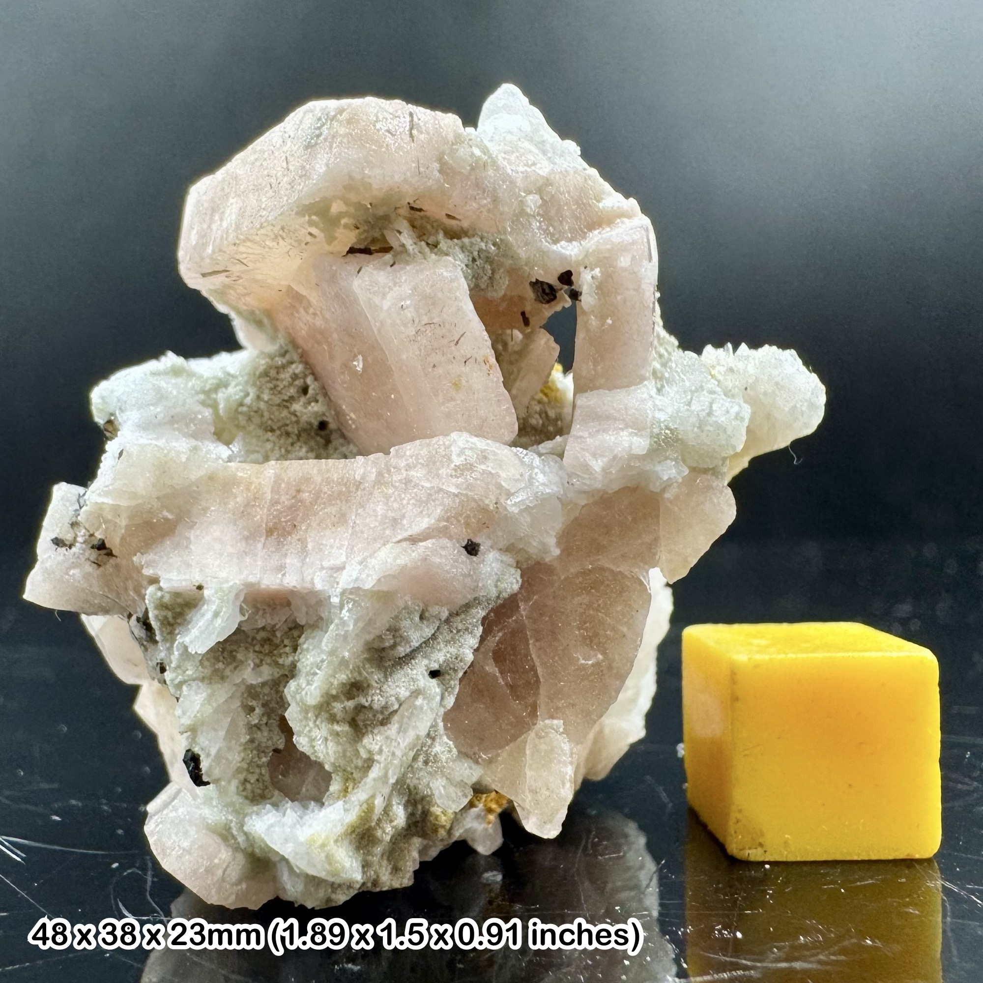This is a rare pink Apatite crystal cluster on natural matrix from the famous mineral-rich region of Skardu, Pakistan. Known for producing exceptional quality minerals, Skardu’s pegmatite deposits are particularly renowned for their colourful gem minerals such as Tourmaline, Aquamarine, Topaz, and Apatite. This stunning specimen showcases vibrant pink Apatite crystals nestled on their natural host rock, offering both scientific significance and visual beauty. The exact crystal shown in the photos is the one you will receive, displayed alongside a 1cm scale cube for accurate sizing. Every specimen is 100% genuine and supplied with a Certificate of Authenticity.